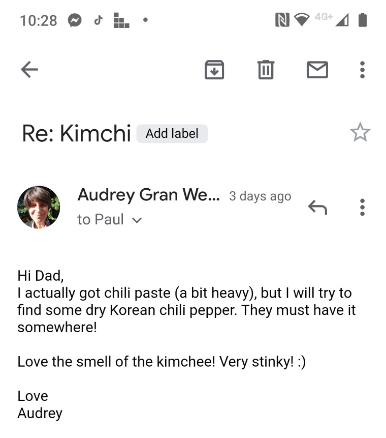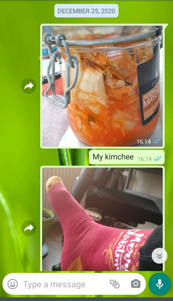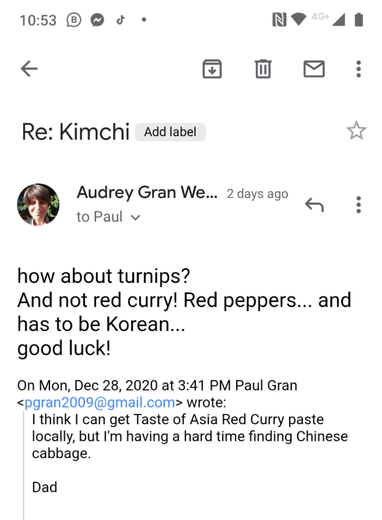 On Sunday, December 27th , Mom and I worked out via Zoom, and my dad took over the kimchee discussion via email because as he puts it, ‘Whatsapp is not a real method of communication.’